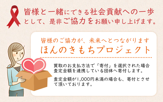 お申し込みを「スピード振込コース」及び「査定結果承認コース」で「返送する」以外をご選択された場合、査定金額が1000円に満たなかった場合は経費(送料等)を差し引いた金額ブックサプライのチャリティプログラム「ほんのきもちプロジェクト」に寄付とさせていただきます。